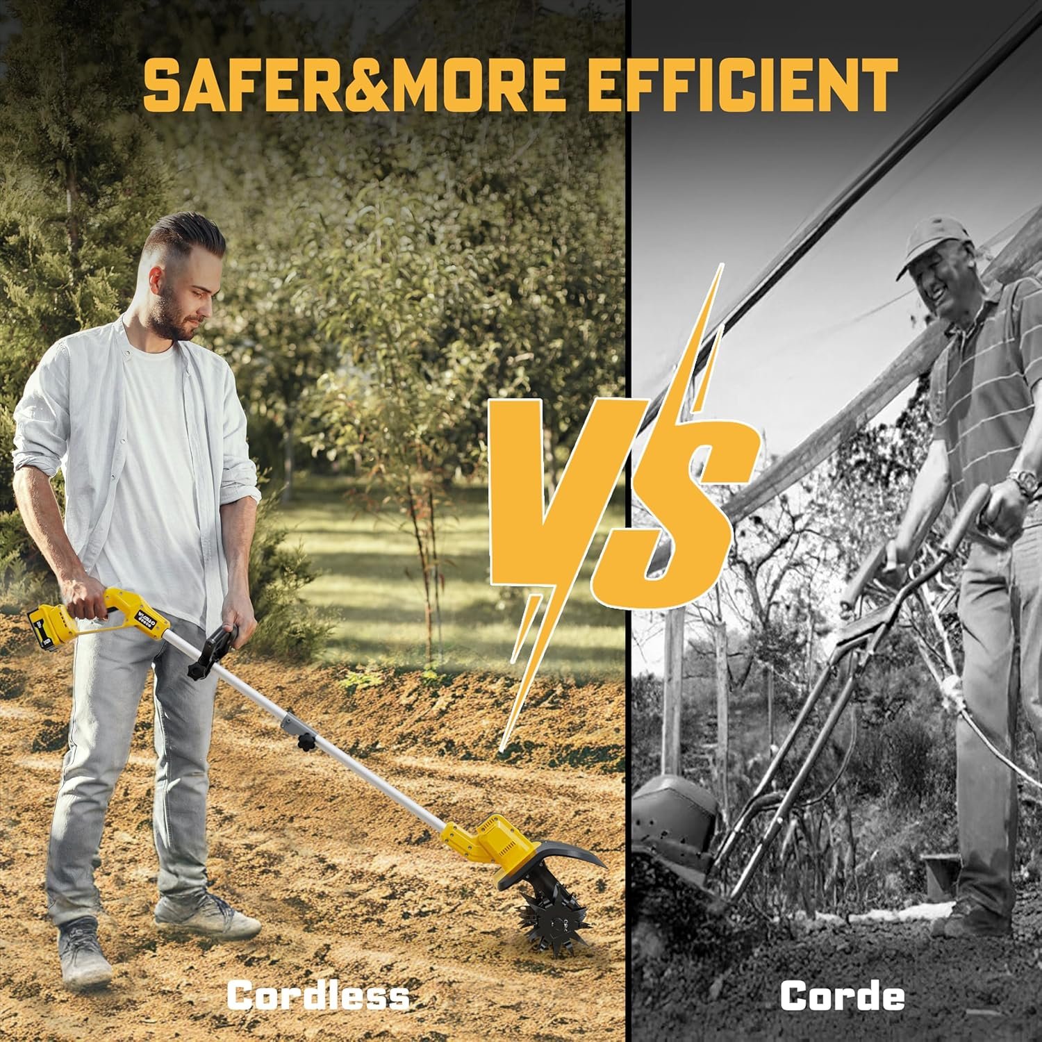 Safety Design: The cordless tiller cultivator comes with a safety switch. Both the safety button and trigger must be pressed simultaneously for operation, keeping you safe while gardening.